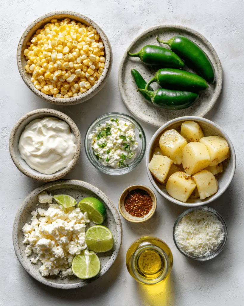 This dish takes its inspiration from Mexican street corn, often called elote or esquites. Traditionally, corn is grilled, coated in creamy sauce, sprinkled with cheese, and finished with lime and spices. It is simple but packed with flavor. Over time, home cooks started turning those same flavors into bowls like this one, adding hearty ingredients like potatoes to make it a full meal. It keeps the spirit of the original while making it easy to prepare in your own kitchen.