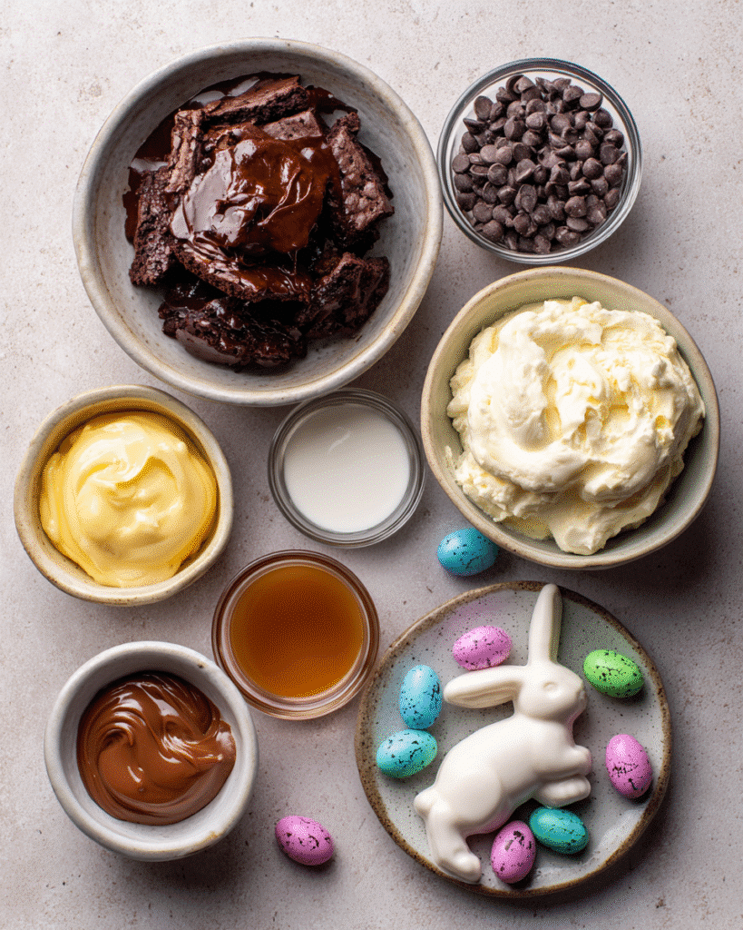- Add Toppings: Before serving, top with whipped cream, caramel drizzle, mini candy eggs, and the chocolate bunny.