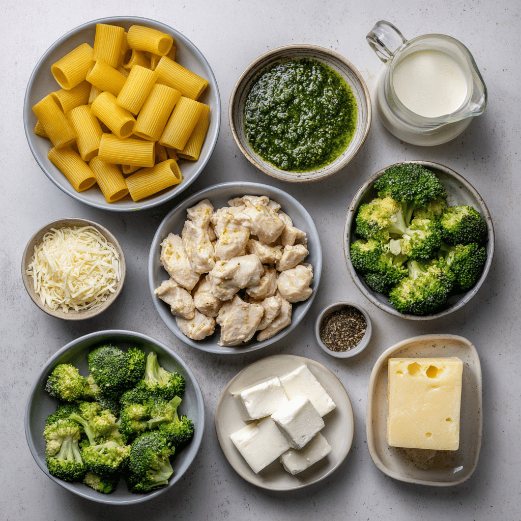 A creamy, cheesy baked pasta made with rigatoni, tender chicken, broccoli, basil pesto, and a rich cream sauce, then topped with mozzarella and baked until hot and bubbly.