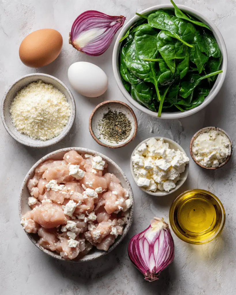 In a large bowl, mix ground chicken, chopped spinach, feta, garlic, onion, breadcrumbs, egg, and seasonings. Don’t overmix.